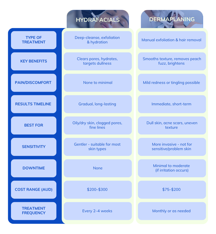 What is your main objective for the treatment you are considering? For clogged pores, blackheads, or dryness, hydrafacial will provide a thorough cleanse. However, if you’re looking to target textured skin, dullness, or peach fuzz, dermaplaning will provide a more suitable option.